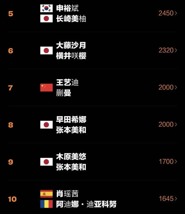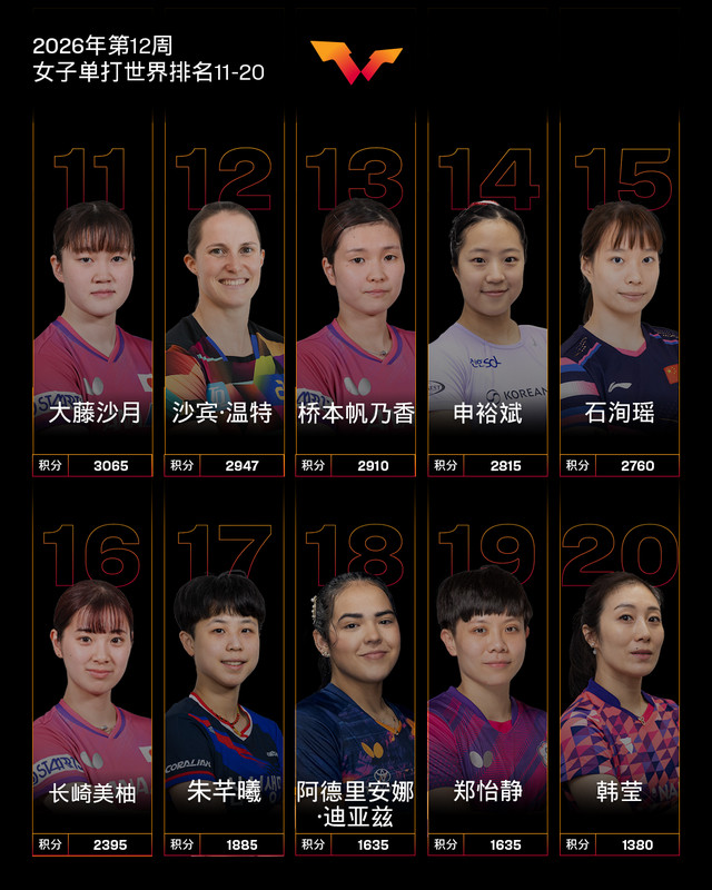 WTT重庆冠军赛女单冠军、日本球员张本美和排名上3个名次位列第5;打入4强的日本球员大藤沙月排名上2个名次位列第11。