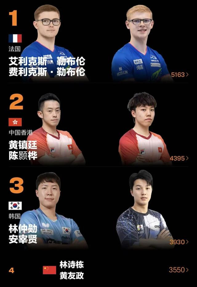 双打方面,排名靠前的组合没有变化,法国的勒布伦兄弟、韩国组合金娜英/柳韩娜和林钟勋/申裕斌分列男双、女双和混双排名榜榜首。