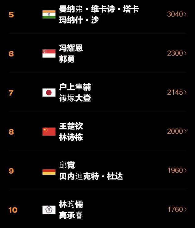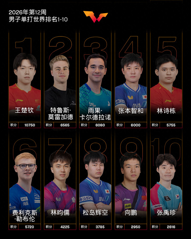 男单前10位中,中国队球员王楚钦位列第1,林诗栋位列第5,向鹏位列第9。