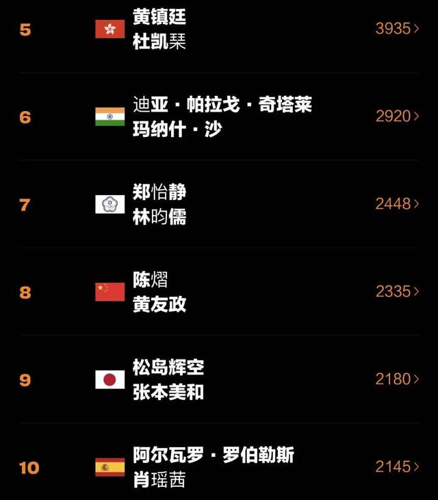 其他排名前50的中国队球员中,梁靖崑排名第13,周启豪排名第22,陈垣宇排名第23,陈俊菘排名第37。